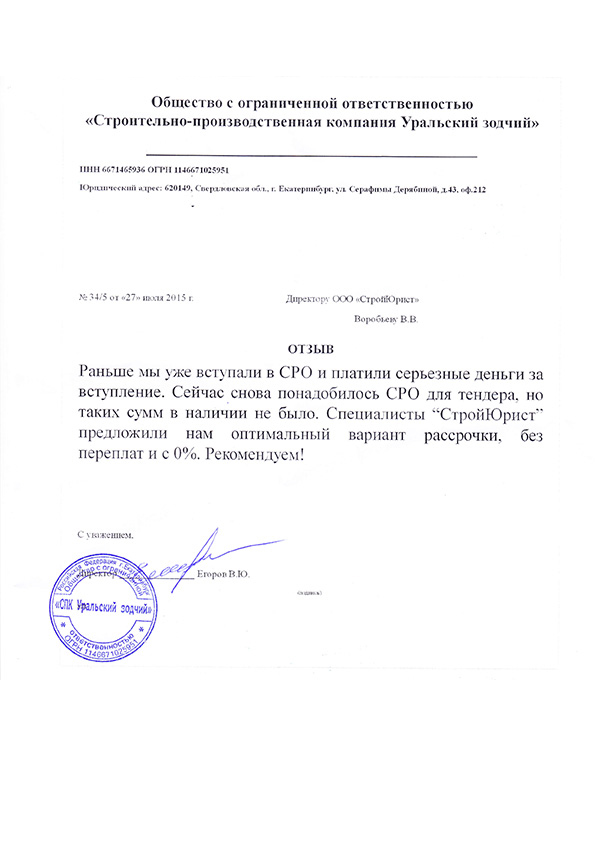 Отзывы клиентов "СтройЮрист" по вступлению в СРО в Раменском